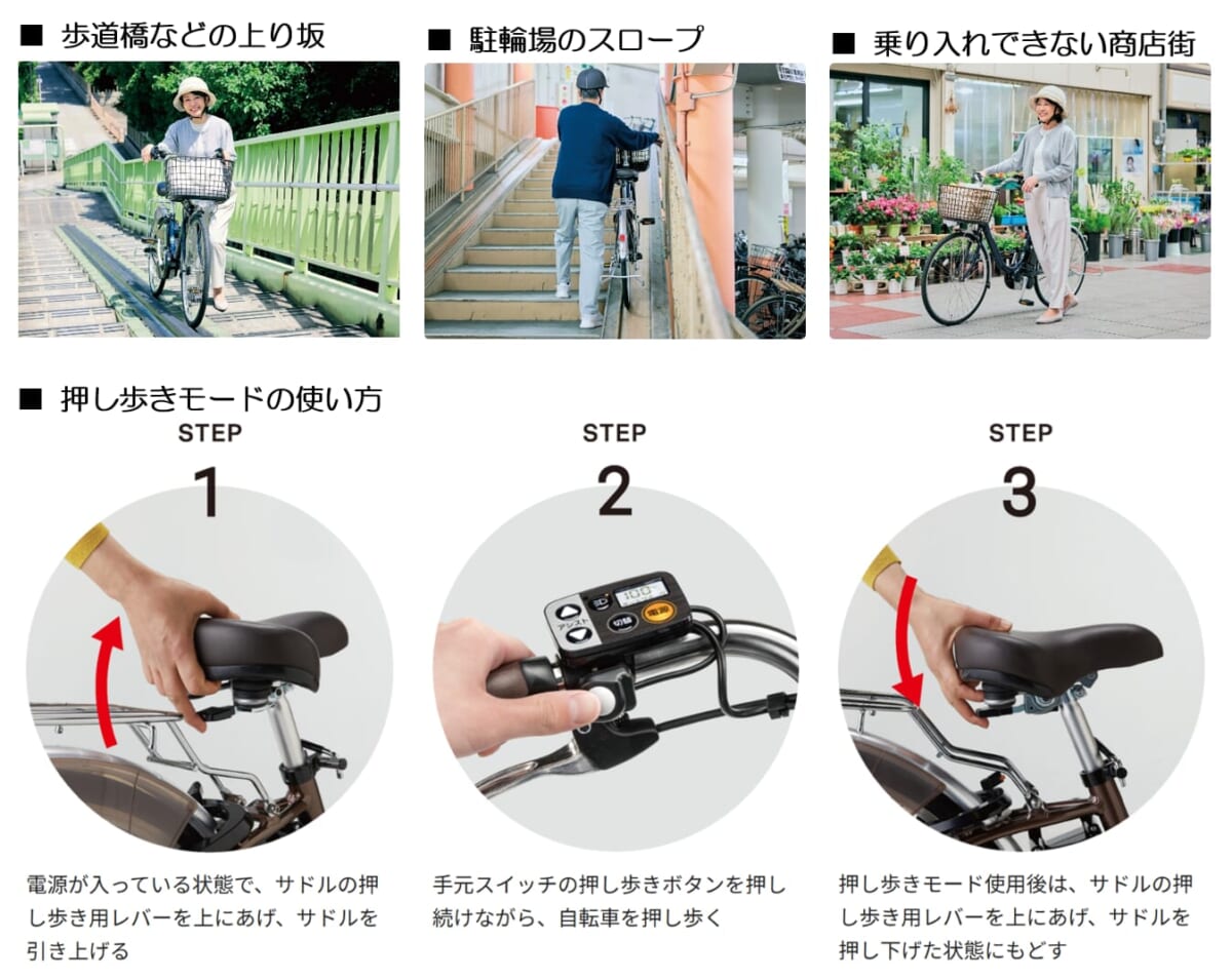 ※あくまで自転車ですので、サドルを跳ね上げて乗車できない状態で押し歩きボタンを押し続けている時のみ”押し歩きモード”は作動します。こがなくても進む特定小型原動機付自転車とは異なります。