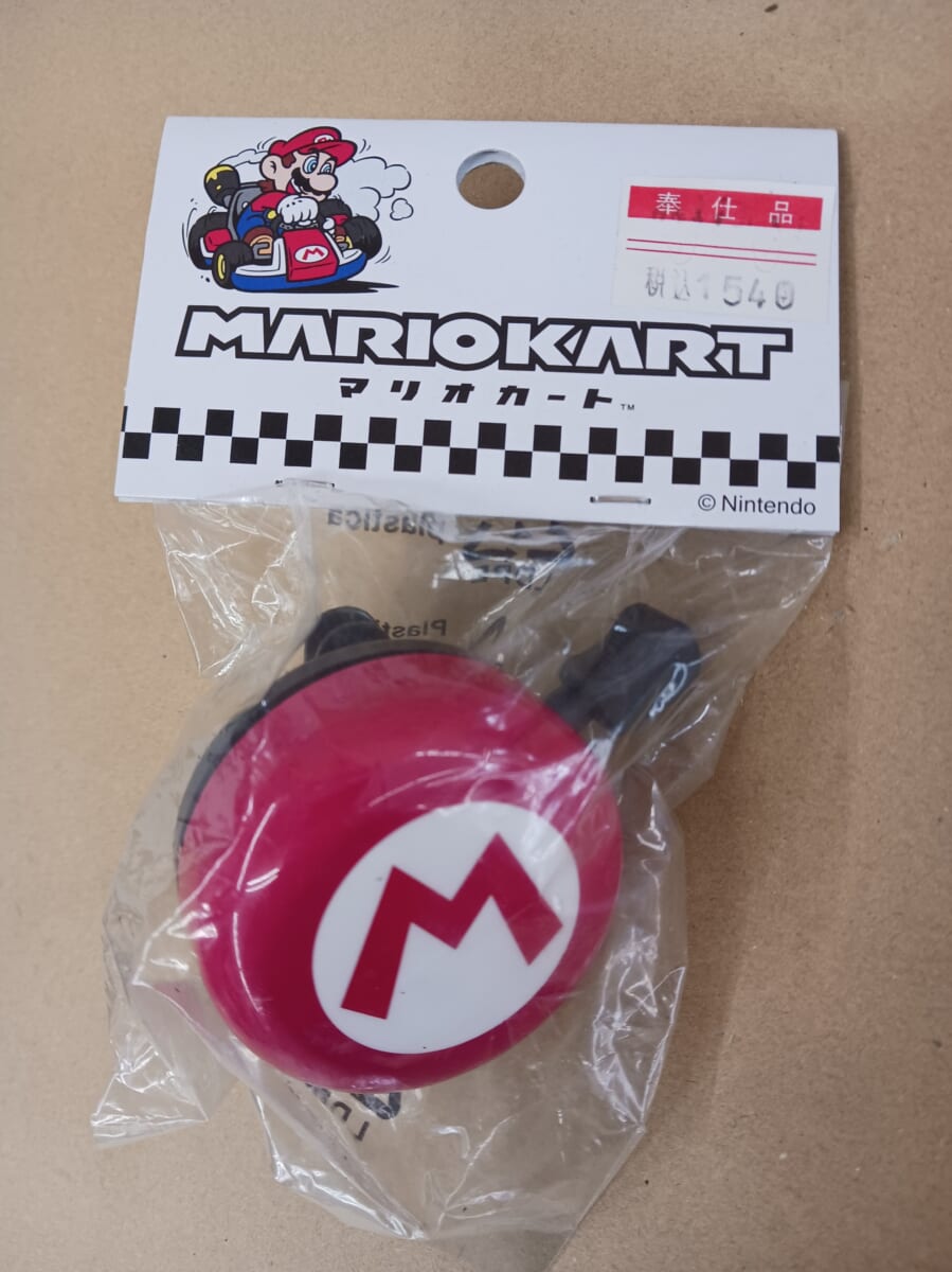 地域密着の自転車屋さんとしては、町おこし(?)に協力するつもりで、こんなの置いてみました!! それがこちら、「マリオカート サイクルベル」です!
