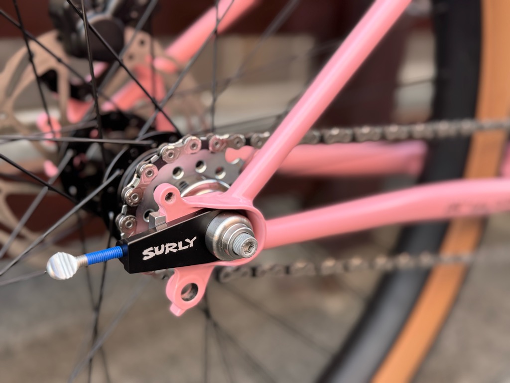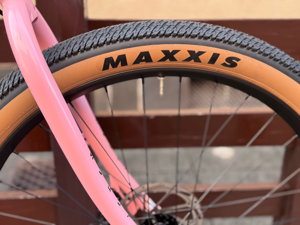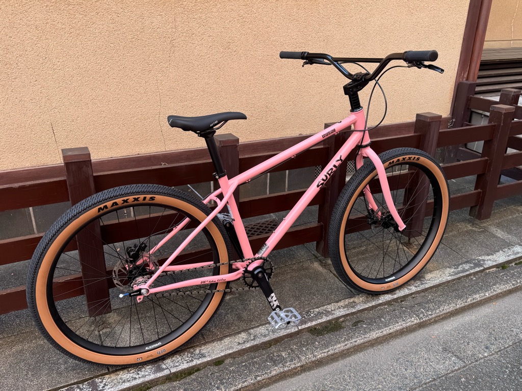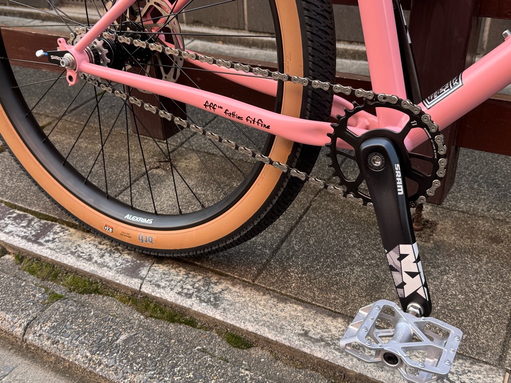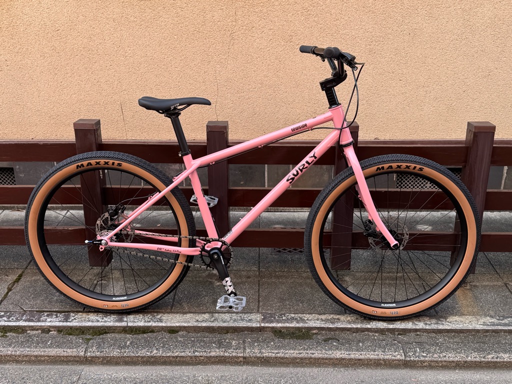 ピンクのフレームにサイドスキンのタイヤがよく似合ってます。