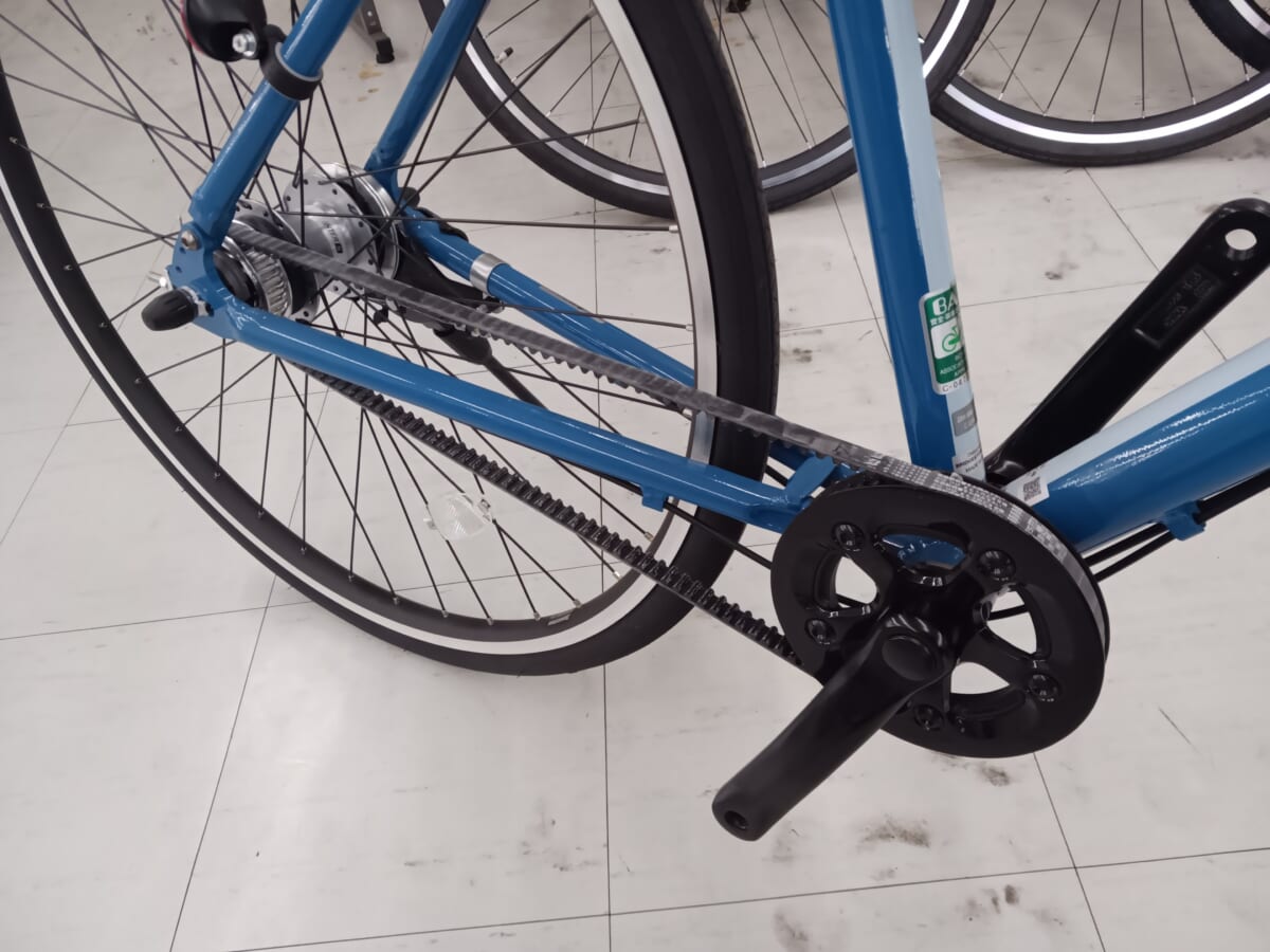 クロスバイクでは珍しいベルトドライブでチェーンはずれや、油での衣類汚れの心配なし!