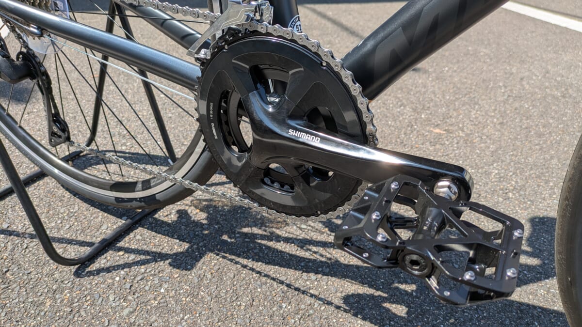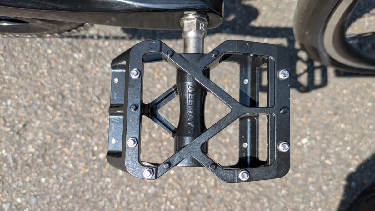 ☝ペダルは別売の車体なので、100km超えのライドもしたい!とのことで回転性能重視でフラットペダルの MKS ALLWAYSをお選びに。なんせベアリングの滑らかさが半端ではないこのペダル。踏面もそこそこ大きめで踏み外しの心配も少ない、通学メインの日常使いに幅広くカバーできる充分すぎる良いペダルです。