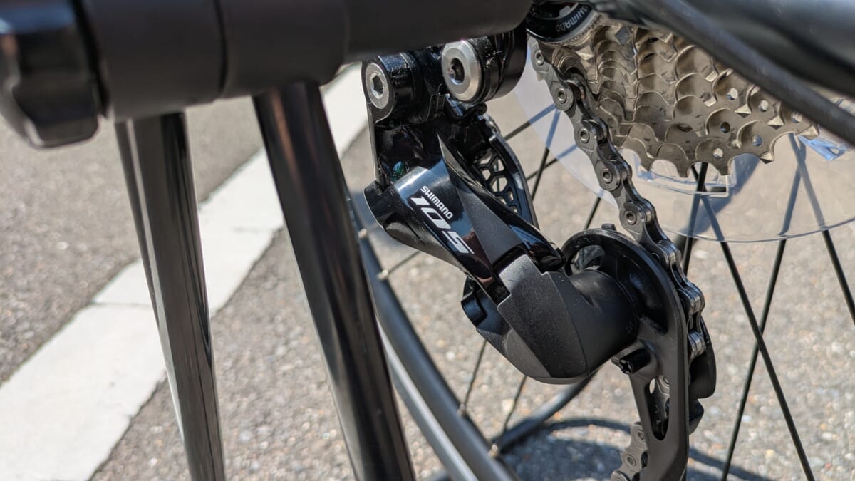 ☝変速周りのグレードは日常使いにはまっったく申し分ないグレードの「105」相当。このパーツのグレードの差で、変速の変わりやすさなどの動作感に差が出ます。スペックと価格帯のお手頃感のバランス良しなグレードです。