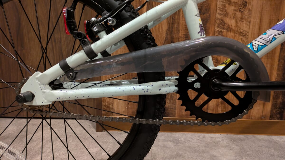 変速がついていない、鉄製パーツ割合多めで構成されていてトラブル少なそうな重厚なつくり。チェーンケースもついててズボン裾の油汚れが少なくて済みそう。