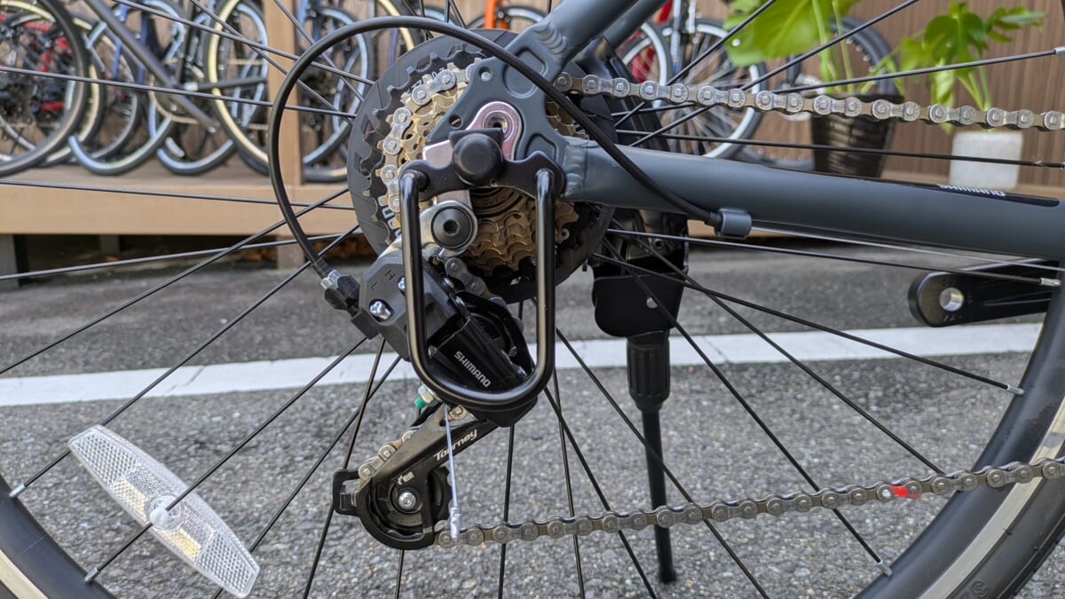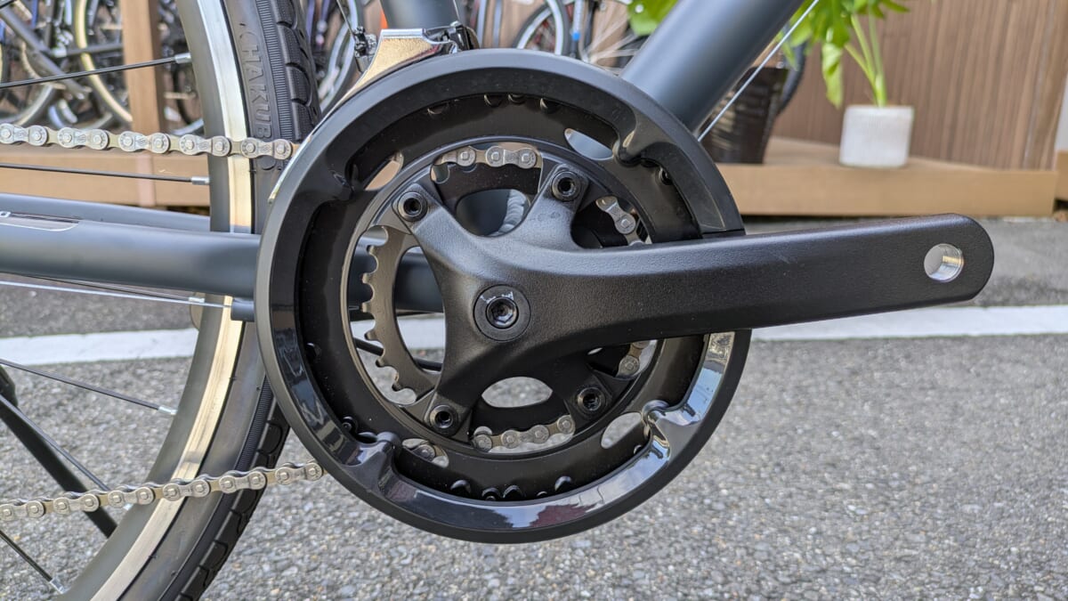 ↑変速は2×7の14段。町中や川を渡る橋周辺の坂道は充分これでこなせます。