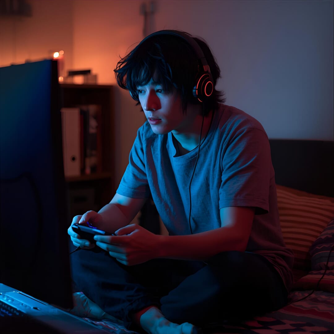 帰宅後、再び布団にごろん!そして手元にあるゲーム機のコントローラーを操作してゲームを起動。