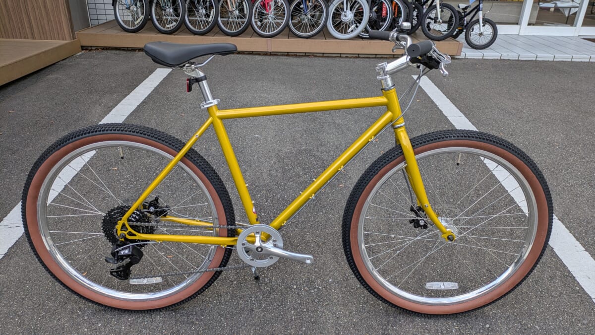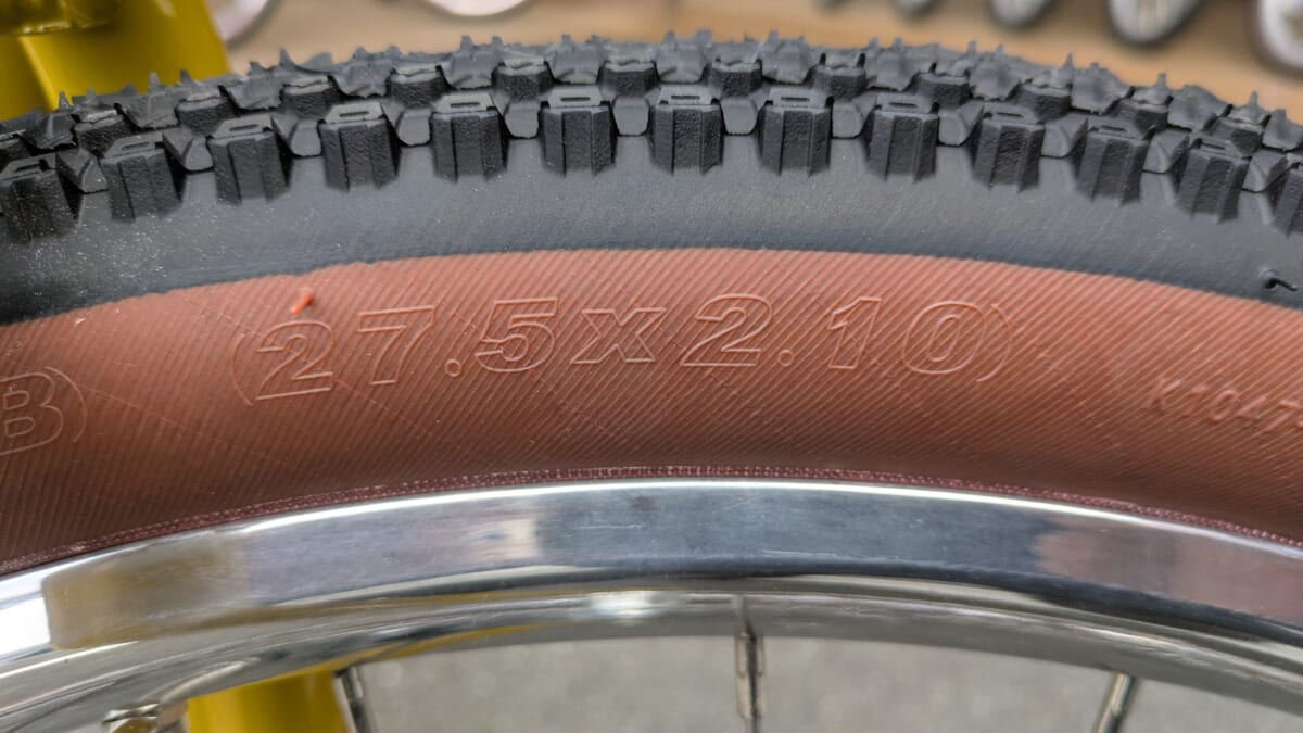 特徴としては効き目とメンテナンス性良しの機械式ディスクブレーキ、太めの27.5インチタイヤ、軽すぎるくらいに軽くできる7段変速、そして重心高めの見た目良しなフレーム形状。