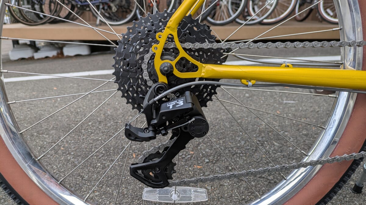 乗った時の感想としては、フレーム設計の工夫や変速が全体的にかなり軽めにギア設定されていることもあり、重量のわりに漕ぎ出しが軽やかに感じました。