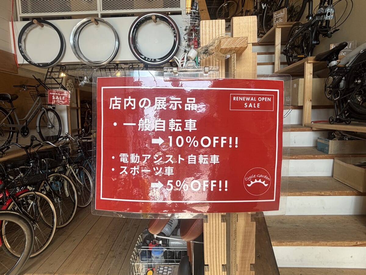 ※上記SALEはサイクルガーデンのみで実施中です。他店舗(サイクルどりーむ、アシスト&サイクル轍では実施対象外となります。ご了承ください。)